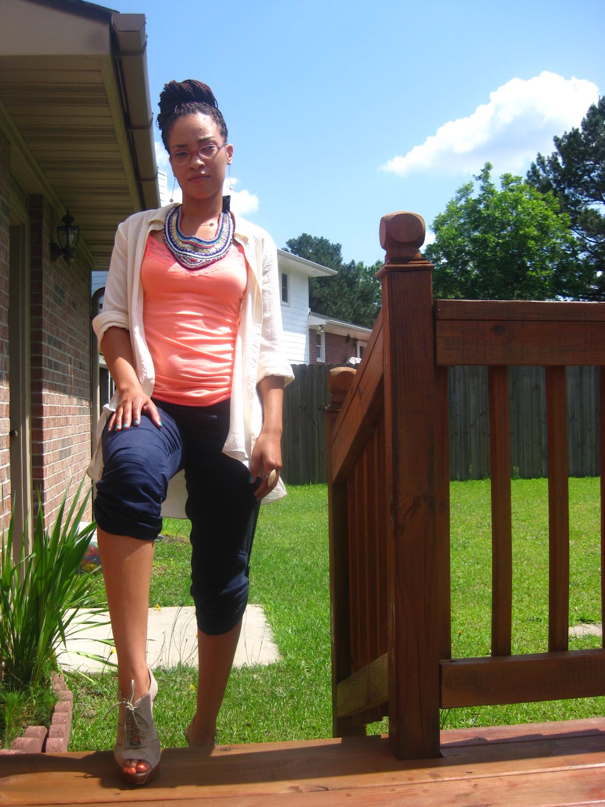 The dark blue linen pants I am wearing are from Splash in Doha. If I remember correctly, they are men pants. I bought them last year because I needed blue slacks to go with my work uniform. I have never wore them anywhere but work and I haven't worked at that job since May 2011. I would have never imagined I'd be wearing them on some flyness; they were uniform pants, for crying out loud!