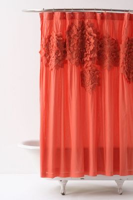 I chose the colors coral, cream and chocolate brown as my accent colors. I think they complement the green beautifully. In the set, I featured a coral shower curtain from Anthropologie, which is actually WAAAY more than what I would pay for a shower curtain but I love the color and the flower detail: